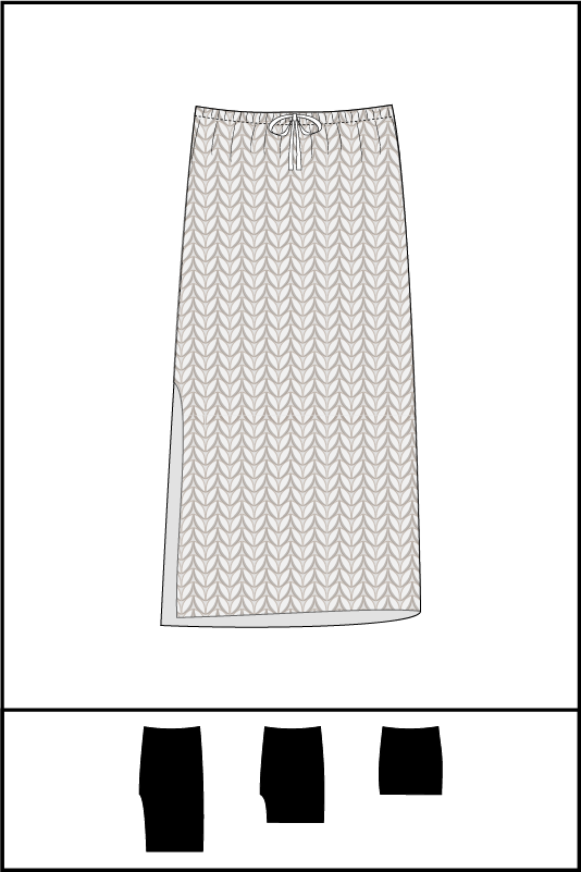 - File formats included: (1) "Print at Home" format that can be used with US Letter and/or A4 size paper, (2) A0 copy shop size, and (3) Projector file with calibration grid, layers, thicker lines, unfolded pieces, and white space around pattern pieces